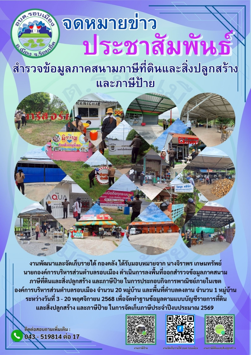 นางจิราพร เกษมทรัพย์ นายกองค์การบริหารส่วนตำบลรอบเมือง มอบหมายให้ งานพัฒนาและจัดเก็บรายได้ กองคลัง ดำเนินการลงพื้นที่ออกสำรวจข้อมูลภาคสนามภาษีที่ดินและสิ่งลูกสร้าง และภาษีป้าย ในการประกอบกิจการพาณิชย์ภายในเขตพื้นที่องค์การบริหารส่วนตำบลรอบเมือง จำนวน 20 หมู่บ้าน และพื้นที่ตำบลดงลาน จำนวน 1 หมู่บ้าน เพื่อจัดทำฐานข้อมูลตามแบบบัญชีรายการที่ดินและสิ่งปลูกสร้าง และภาษีป้าย ในการจัดเก็บภาษีประจำปีงบประมาณ 2569 ระหว่างวันที่ 3-20 พฤศจิกายน 2568