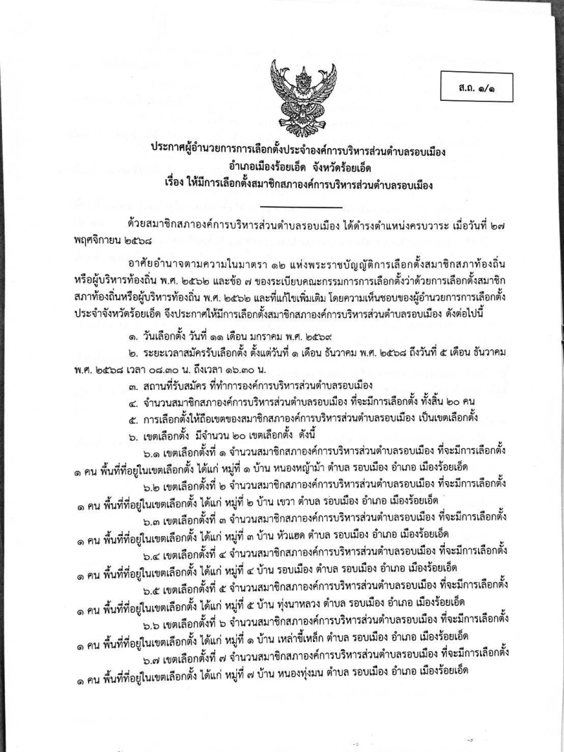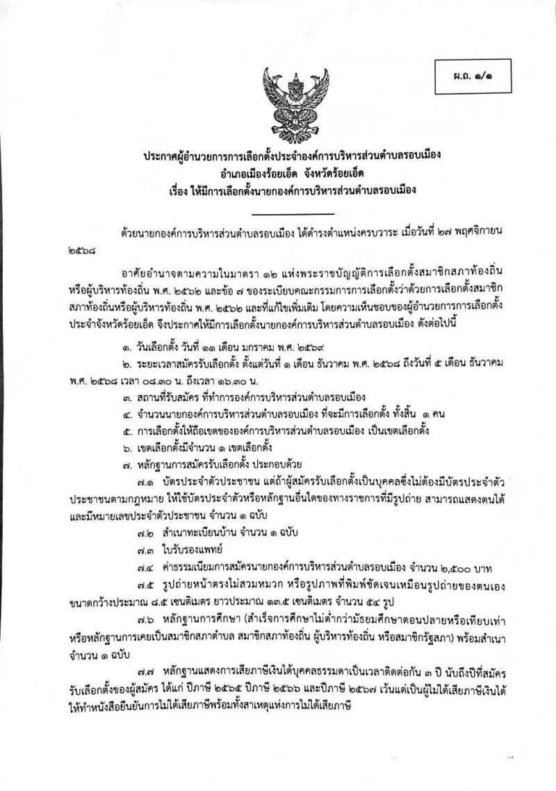 หัวข้อ :: ประกาศผู้อำนวยการการเลือกตั้งประจำองค์การบริหารส่วนตำบลรอบเมือง อำเภอเมือง จังหวัดร้อยเอ็ด