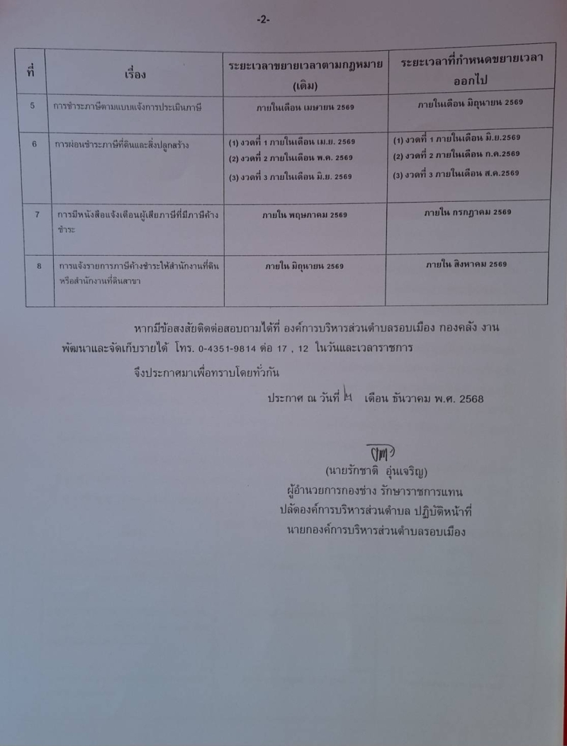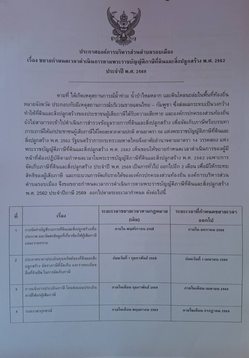 หัวข้อ :: ประกาศองค์การบริหารส่วนตำบลรอบเมือง เรื่อง ขยายกำหนดเวลาดำเนินการตามพระราชบัญญัติภาษีที่ดินและสิ่งปลูกสร้าง พ.ศ.2562 ประจำปี พ.ศ.2569